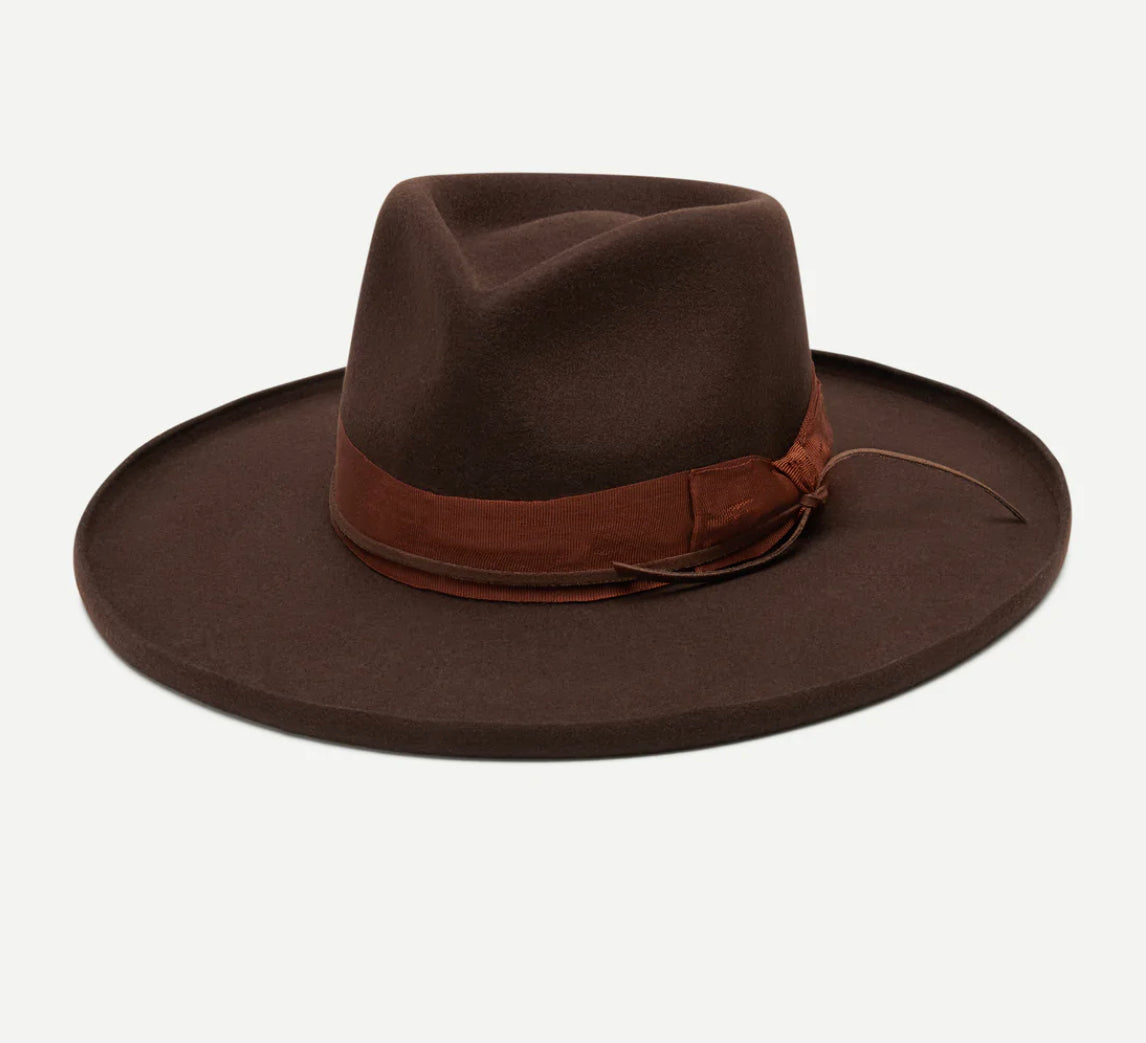 Our Delaney is a wide brim fedora rancher with a tear drop crown, stiff wide pencil brim, and features a distressed gros grain ribbon and genuine leather string trim.