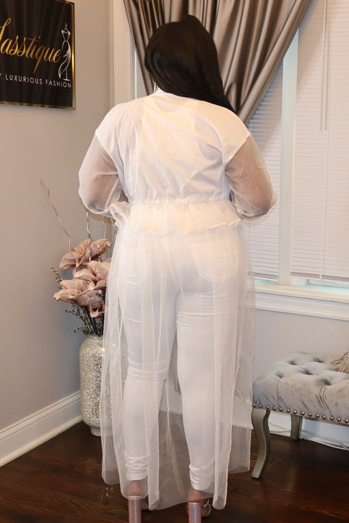 Gorgeous white jacket with sheer sleeves and paneling. Featuring a drawstring waist with ruffle accent, long sheer bottoms. This will give you the perfect feminine silhouette. Pair with your fav denim jeans and a bodysuit to complete your look.