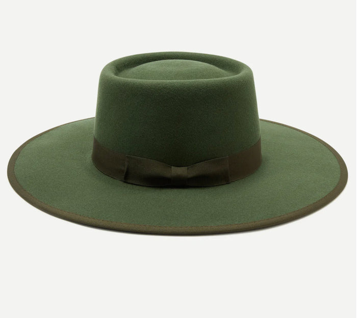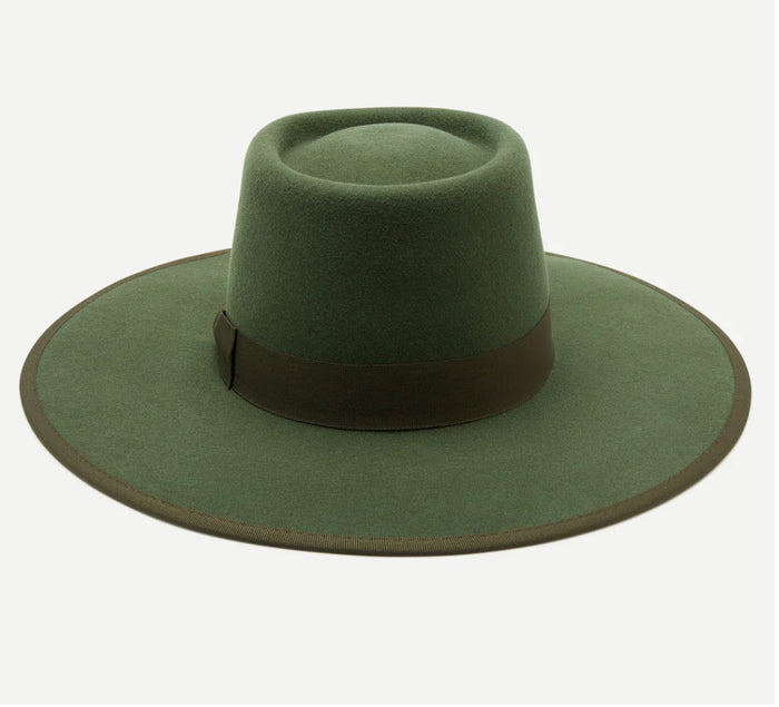 Ysenia is a 100% Australian wool felt wide brim fedora with a round telescope crown. She's trimmed with gros grain ribbon on the crown and brim, and features a tacked bow.
